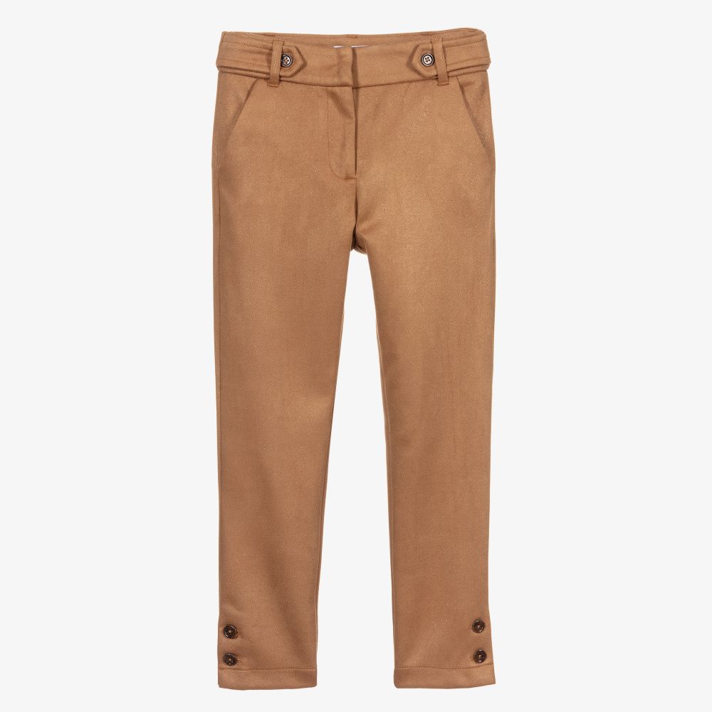 Smart camel brown trousers for girls by Mayoral. They are made in soft twill and have a touch of silver sparkle. The waistband is adjustable and has button tab detailing on the front. There are side pockets and button-fastening ankle vents.