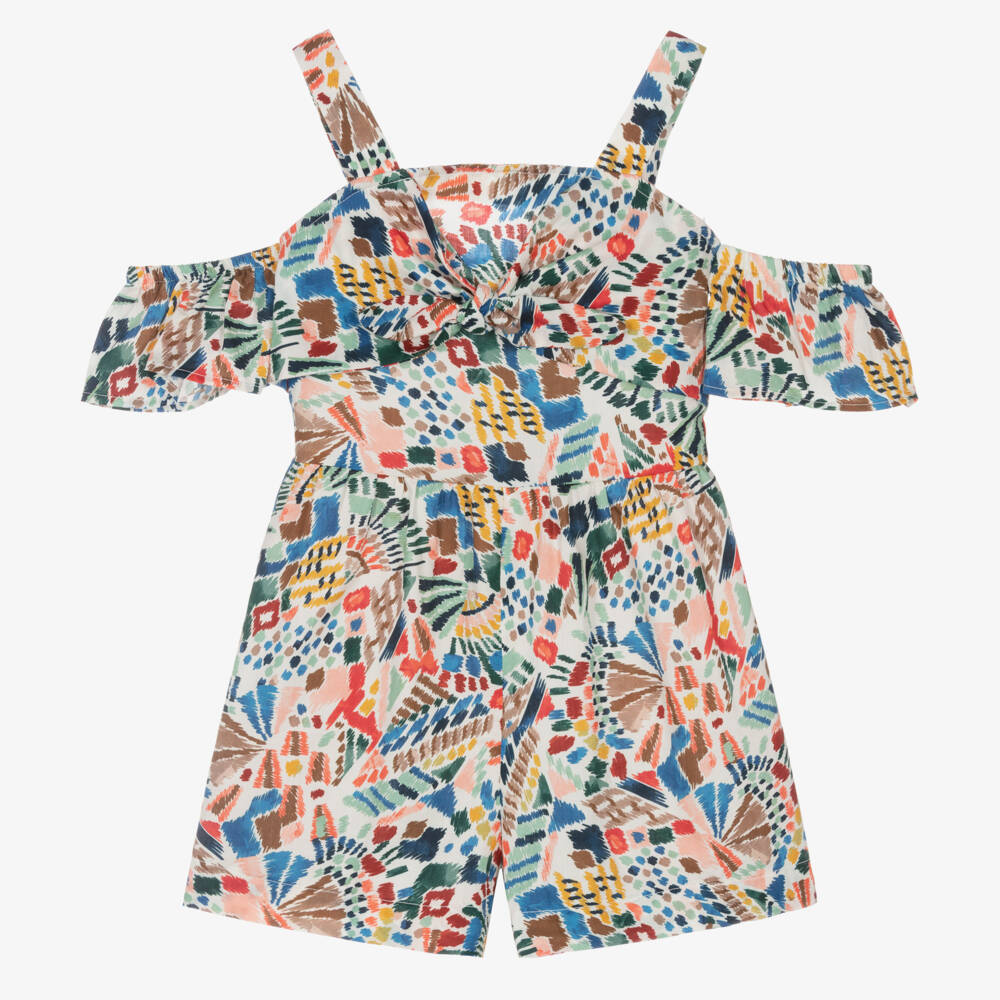 Colourful abstract print playsuit for girls by Mayoral, made in soft and lightweight cotton with a lovely silky feel. It has elasticated off-the shoulder sleeves, shoulder straps and a pretty tie detail on the bodice. It is gathered at the waist to create comfortable relaxed fitting shorts and fastens with a concealed zip on the back.
