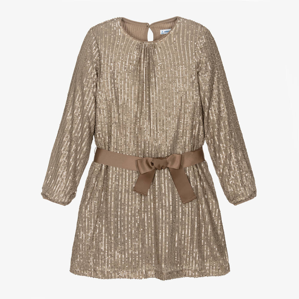 A chic gold-tone dress for older girls by Mayoral, covered in soft-shine sequins for a lovely subtle shimmer. Made in fine tulle with a comfortable jersey lining, this occasion style has a simple, relaxed A-line silhouette. The long sleeves are gathered at the stretchy cuffs and a stylish keyhole button fastens on the back. The dress comes with a dark beige grosgrain ribbon tie to cinch the waist for a beautiful finishing touch.