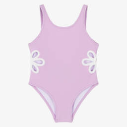 Green swimsuit for girls by Mayoral, patterned in a fun and colourful watermelon ice cream print. Silky smooth and stretchy, it has frilled shoulder straps which cross over at the back.