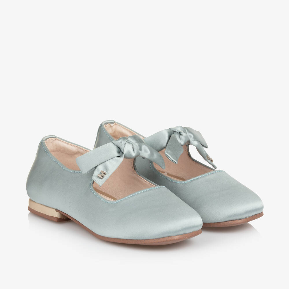 Gorgeous green satin shoes for girls by Mayoral, with a pretty sheen. Easy to slip on, this sweet style has an elasticated strap across the foot, decorated with a cute bow. They are lined in soft leather, with a lightly cushioned insole and non-slip rubber outer sole for good grip.