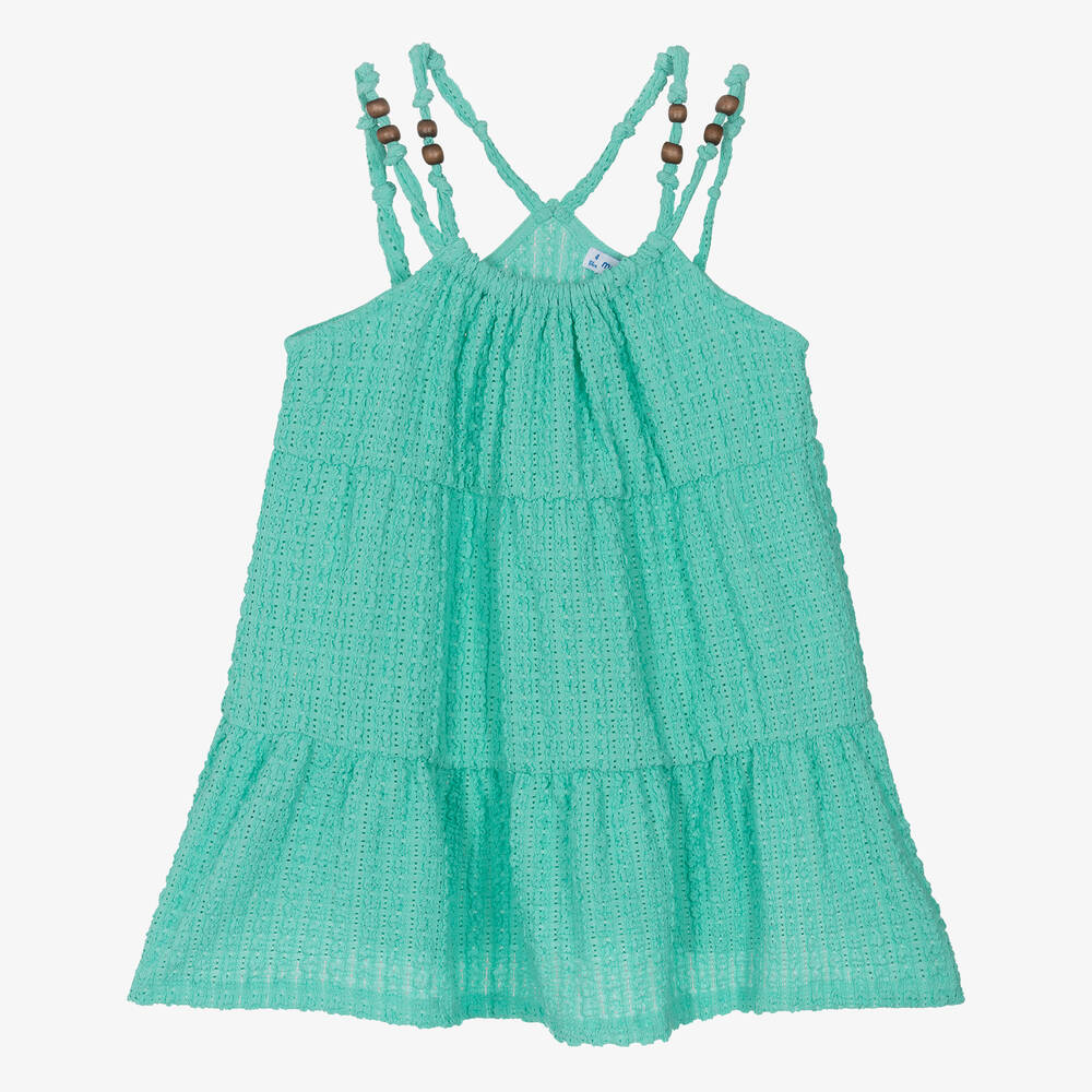 Pretty pale green sun dress for girls by Mayoral, embellished with wooden beads on the shoulder straps. Lightweight, stretchy and textured, this mesh-style fabric is ideal for warm, sunny days. Easy to wear, it simply slips on.