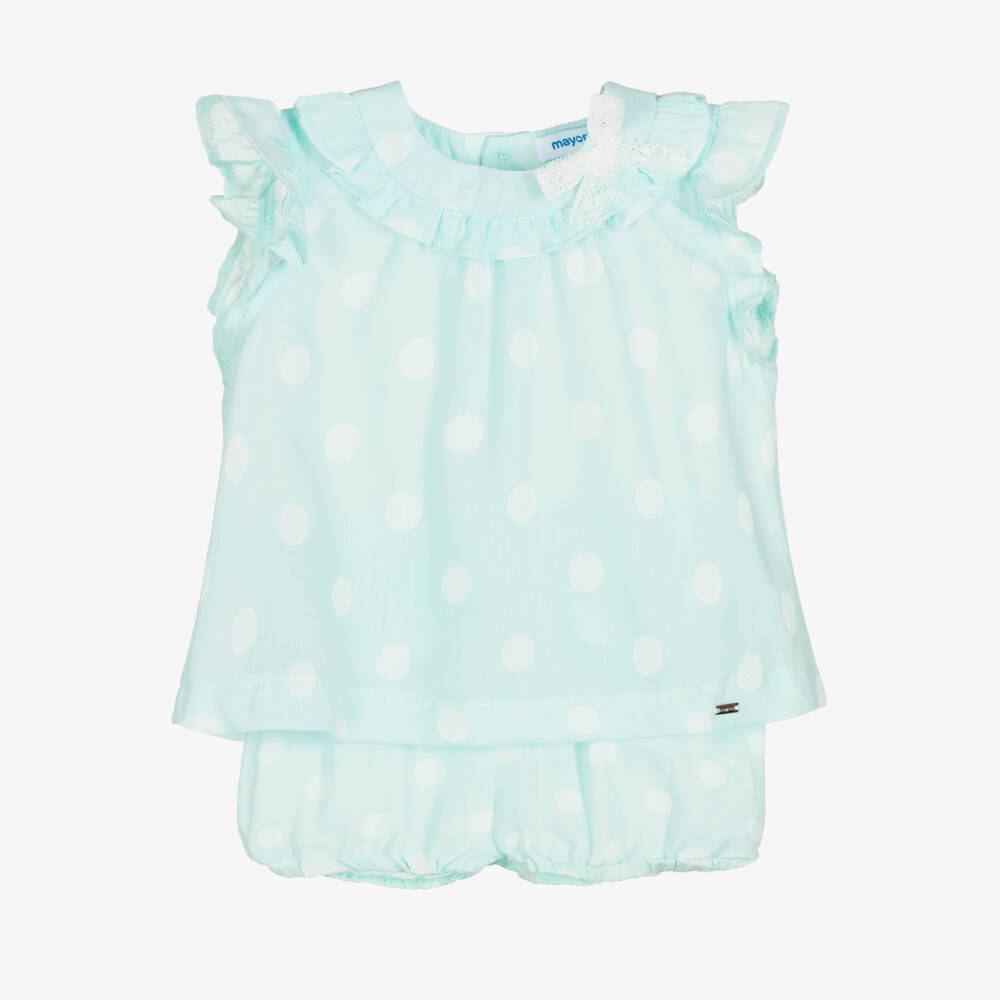 Cute mint green and white polka dot shorts set for little girls by Mayoral. Woven in lightweight cotton, the top has a girly lace bow on the ruffle collar and flutter sleeves. It fastens with buttons on the back, and has a shiny silver logo embossed charm on the hem. To complete the pretty look, the ruffle bloomer shorts have stretchy elasticated trims for comfort.