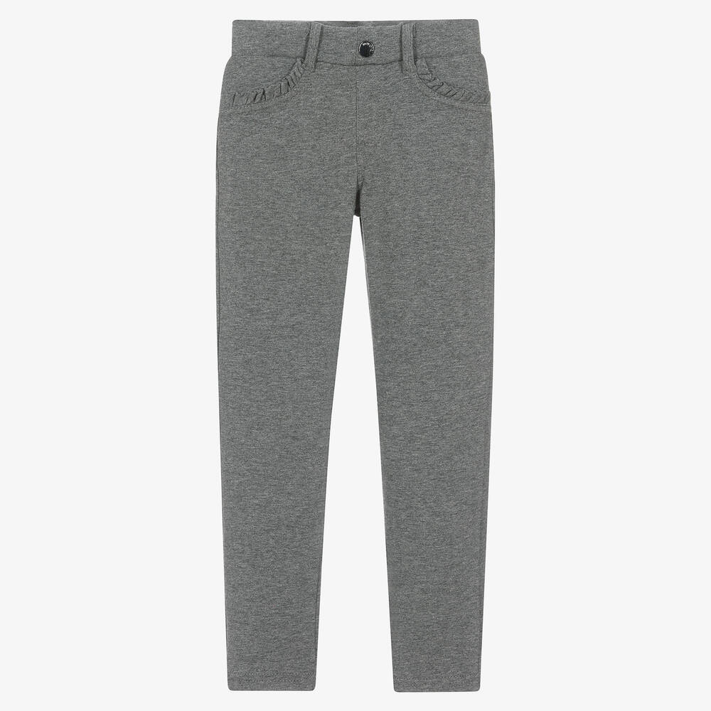 Mid-grey trousers for girls from Mayoral, in a super-skinny fit. So comfortable in cotton, they are made in soft, stretchy and medium-weight jersey, with a fleecy-feel underside for added cosiness. They have frill-trimmed faux front pockets, bow details on the back pockets, and a beige faux leather patch on the back. The softly elasticated waist is detailed with a silver-tone faux button on the front and is adjustable for the ideal fit.
