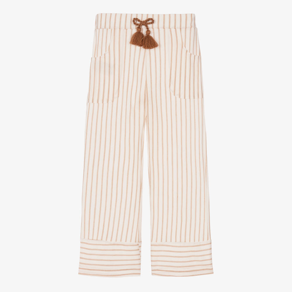 Ivory trousers for girls by Spanish brand Mayoral, designed in a classic beige stripe. Made in a soft and lightweight cotton blend, they have deep side pockets and wide hems for a contrasting finish. In a wide leg shape for relaxed style, there is a golden brown, plaited bow on the waist with fun tassel ends. The waist is elasticated for a comfortable fit and feel.