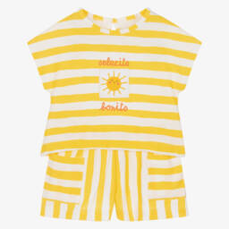 Lovely ivory hat and scarf set for girls by Mayoral, softly knitted with black stripes and pretty scalloped trims. The hat has a large pom-pom on the top for a standout, stylish finish.