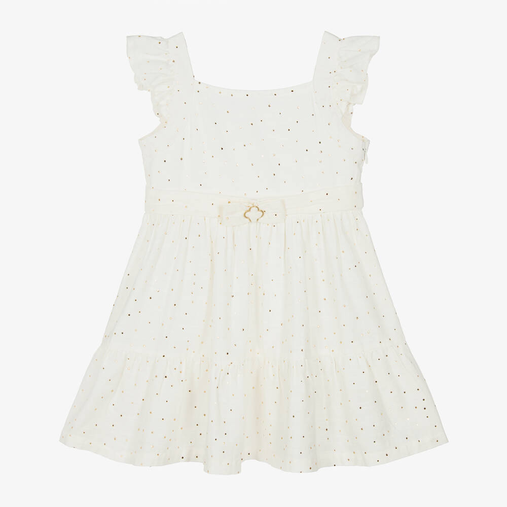 A charming ivory cotton dress for girls from Spanish brand Mayoral. Soft and lightweight, it has a tiny stud-like gold polka dot pattern printed for added sparkle. The bodice is lined for comfort and the concealed side zip neatly fastens on the side. Effortlessly chic, this sleeveless dress is styled with a V-back, ruffles on the shoulder and a fixed sash with a bow on the front for a pretty finishing touch.