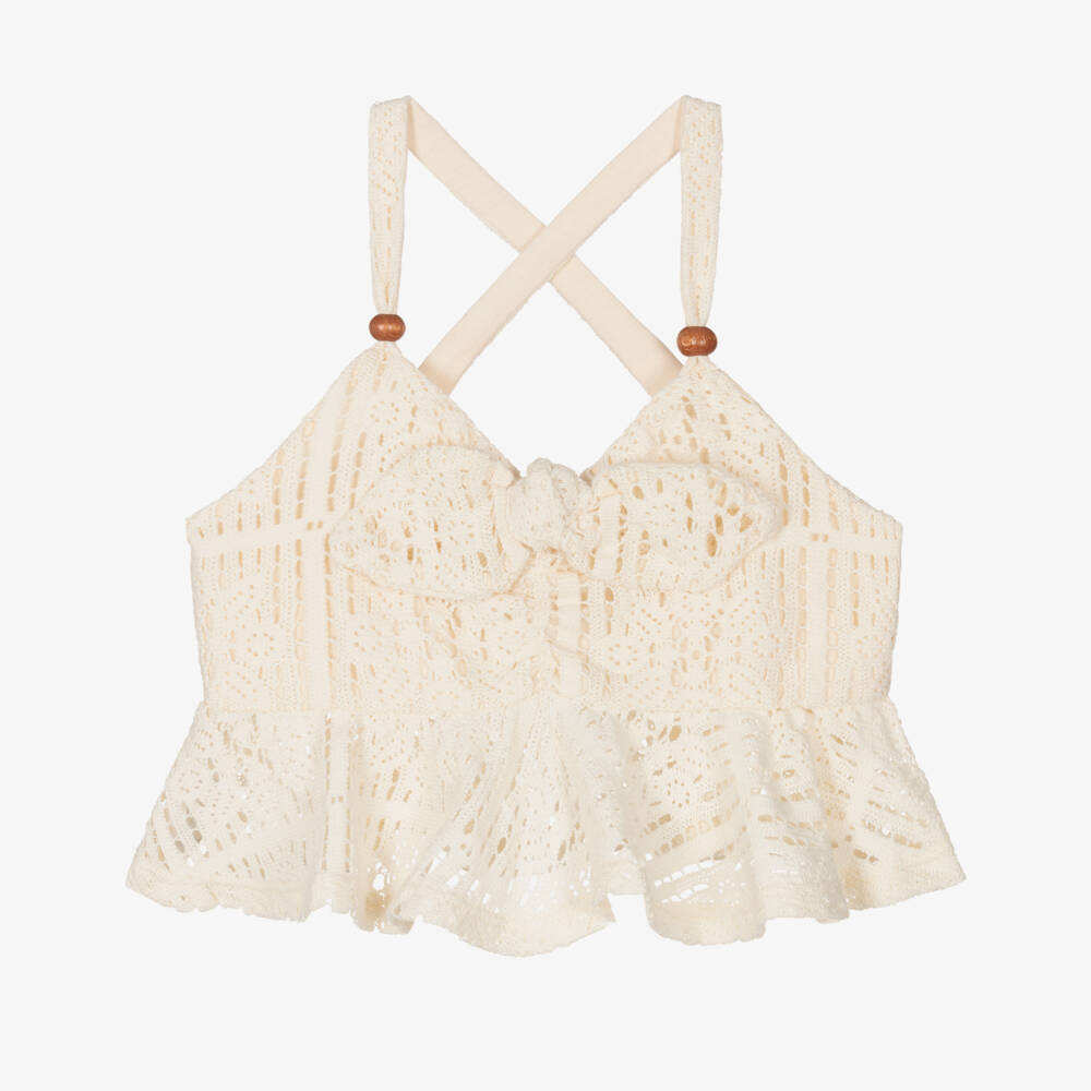 Pretty ivory crochet top for girls by Mayoral, in a cropped length with a ruffled hem. Made with cotton and lined in soft jersey for comfort, it has a bow detail on the front and cross-over shoulder straps trimmed with wooden buttons.