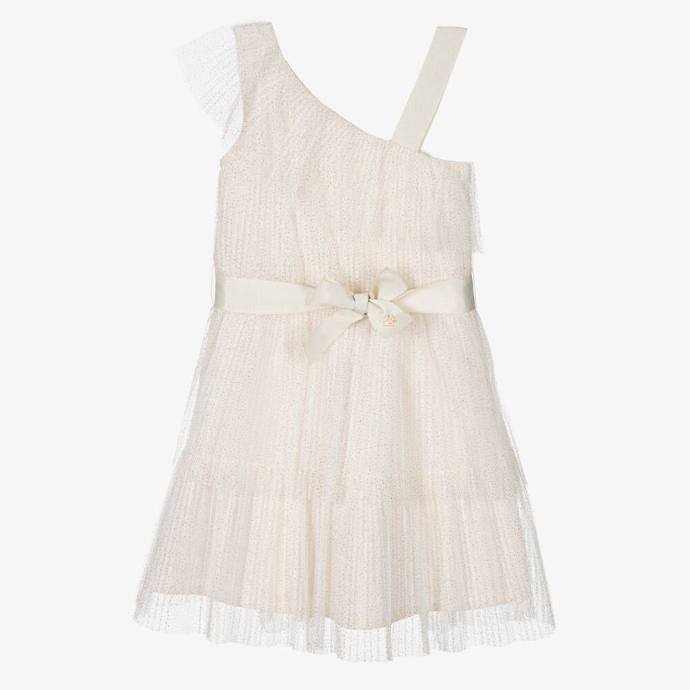 Gorgeous ivory pleated tulle dress for girls by Mayoral, with shiny gold dots for a touch of sparkle. Lovely for a special occasion, this elegant asymmetric style has ruffle trim around the bodice and over one shoulder, with a gold grosgrain strap on the other shoulder. The skirt is tiered for a pretty effect and there is an attached ribbon sash on the waist with a gold logo charm on one end. The dress is fully lined for comfort and fastens with a concealed side zip.