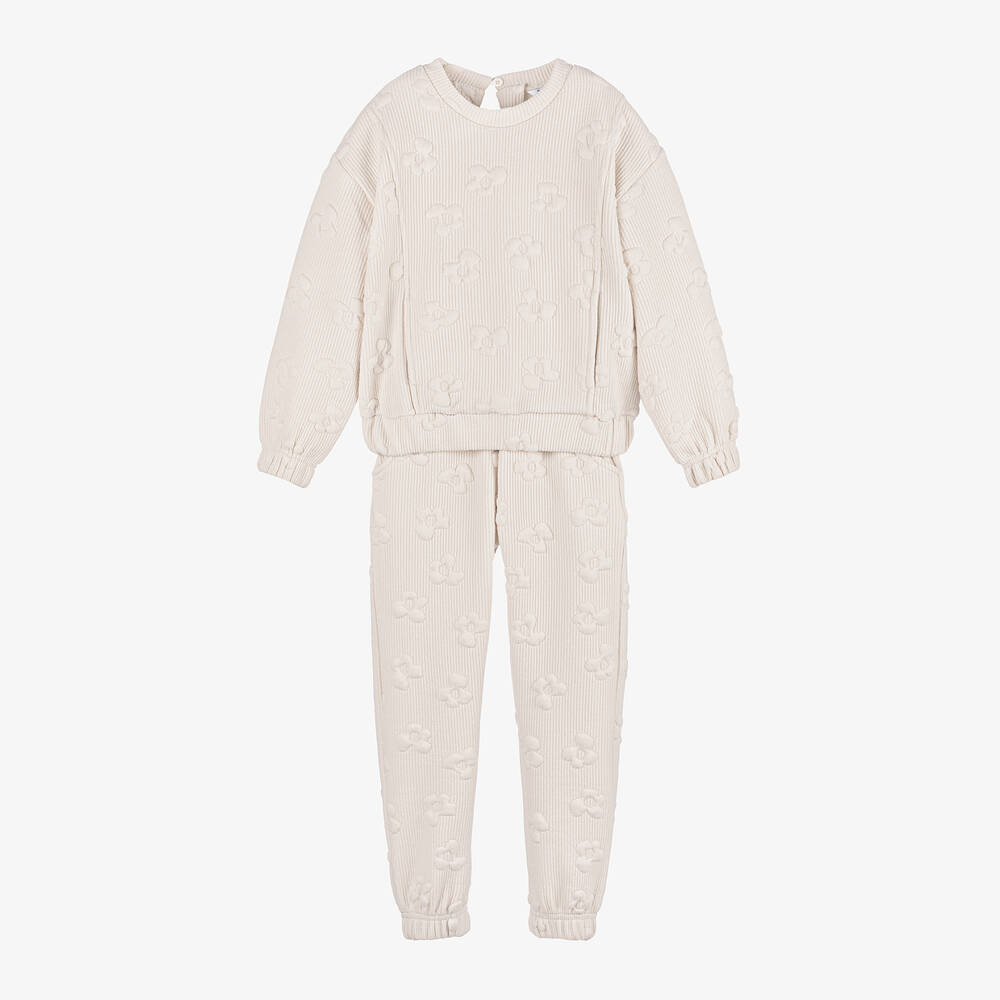 Girls ivory tracksuit by Spanish brand Mayoral, in a ribbed viscose blend with added stretch. Patterned with raised flowers, the long-sleeved sweatshirt has elasticated trims and a concealed pouch pocket on the front. It has a round neckline and a keyhole button fastening on the back. Completing this casual look, the matching joggers have useful front pockets and decorative drawstring ties. The elasticated waistband ensures a comfortable fit, whether they're going out for the day or lounging.
