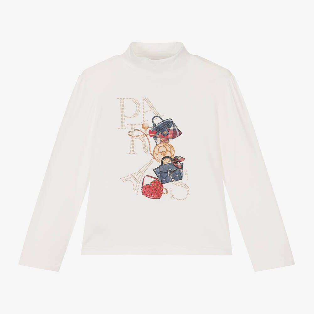 An ivory long-sleeved roll neck top for girls by Mayoral, made in super-soft viscose jersey. Capturing Parisienne style, this lovely top has four elegant handbags printed on the front, accompanied by a gold-studded design spelling 'Paris'.