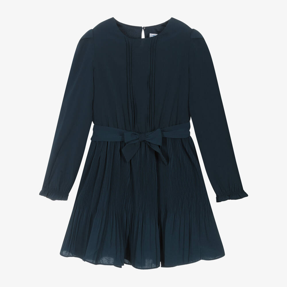 Navy blue dress for older girls by Mayoral, made in lightweight crêpe chiffon fabric. The full skirt is pleated and lined for comfort. There are stylish pintucks on the front of the bodice and pretty, delicately puffed long sleeves with elasticated cuffs. This lovely dress has a removable tie belt and a single keyhole button fastening on the back.