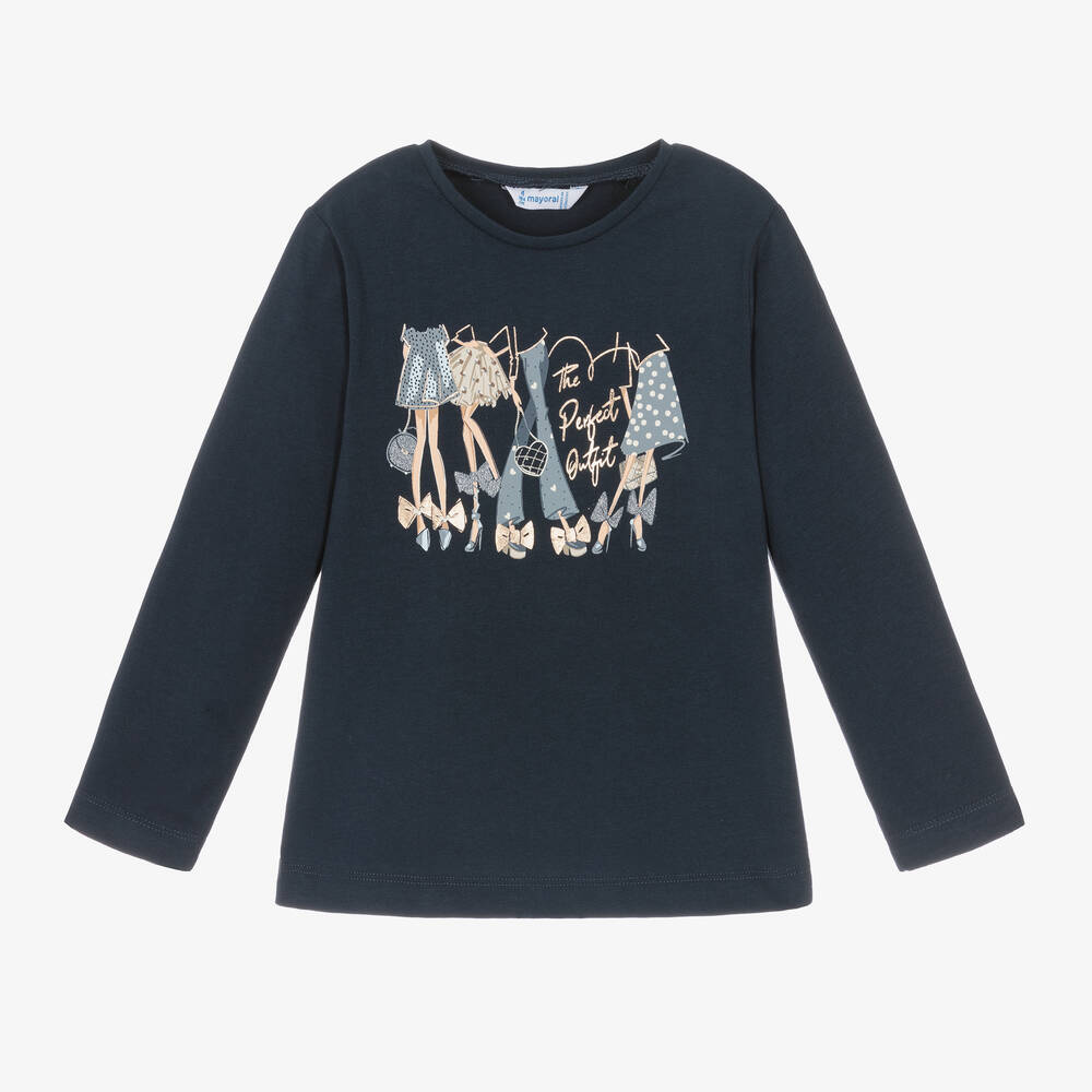 A navy blue cotton top for girls by Mayoral, made in soft jersey. Accented by silver glitter, the front has a fashion-forward outfit print with gorgeous dresses and high-heeled bow shoes.