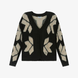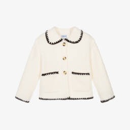 Girls navy blue cardigan by Mayoral, made in a soft ribbed knit with glittery thread and frilly trims. This pretty style has a detachable, faux fur collar and a gold-tone bow-shaped button on the neck with a diamante for extra sparkle.
