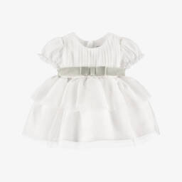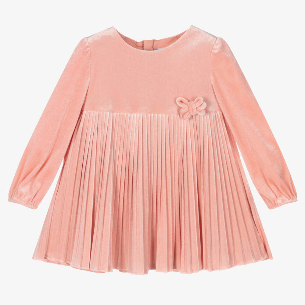 Gorgeous pale pink dress for little girls, by Mayoral. Made in super soft and stretchy velour, it has a pretty bow appliqué on the waist, a smart pleated skirt, and a concealed zip on the back for easy dressing.