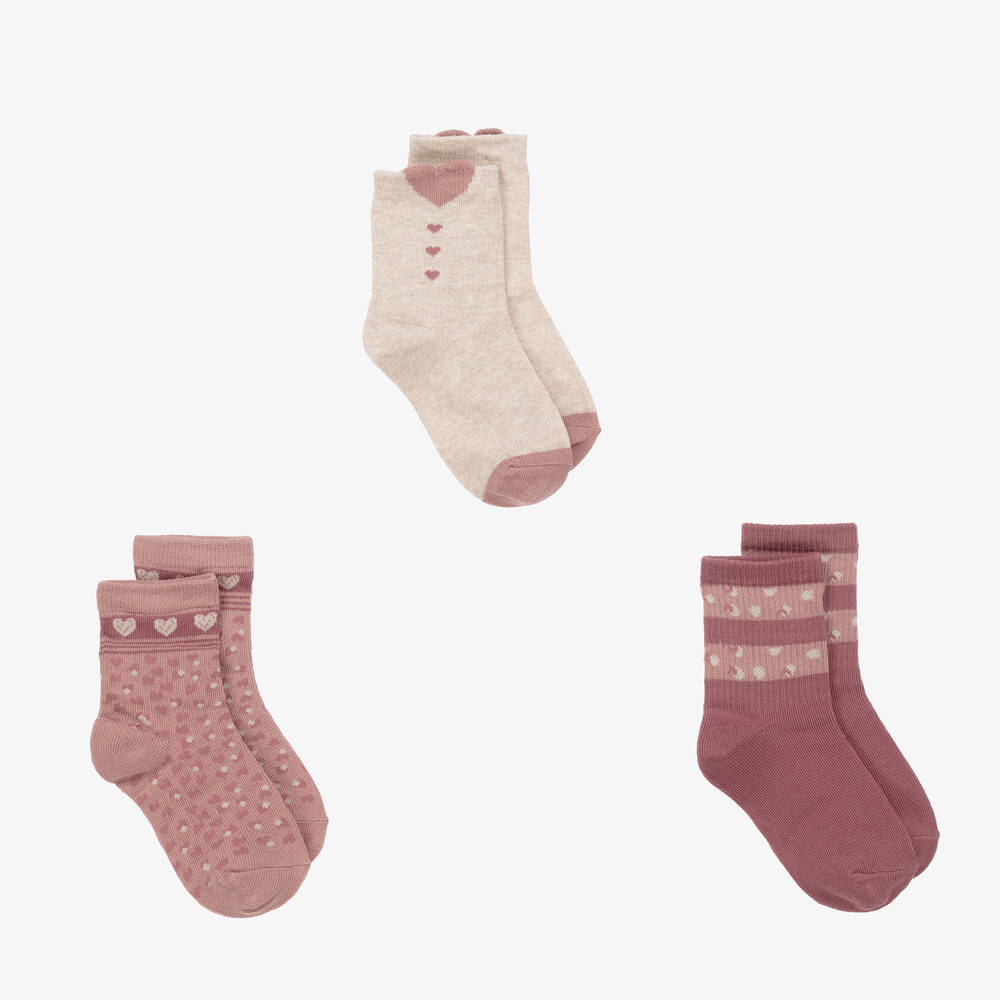 Pack of three pairs of pink and beige marl socks for girls by Spanish brand Mayoral. Made in a soft cotton blend, they have coordinating heart patterns. This item contains organic cotton.