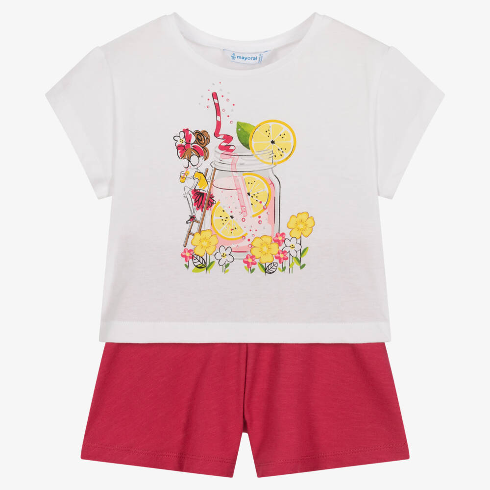 White and pink shorts set for girls by Spanish brand Mayoral, made in super soft sustainable cotton jersey. The T-shirt has a summery lemonade and cool girl printed on the front with stylish cut-out shoulders. The pink shorts are gathered, with flared legs and an elasticated waistband for comfort.