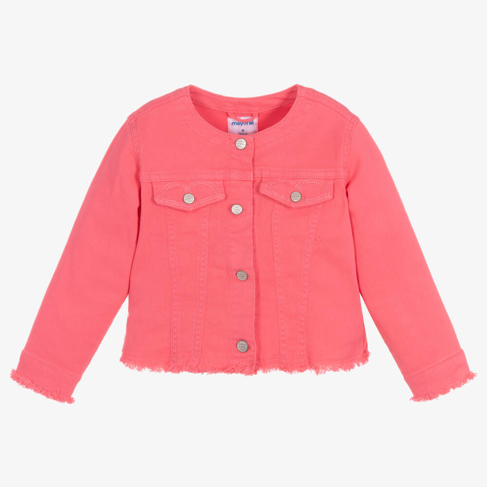 Pink jacket for girls by Mayoral, made in soft, sustainable cotton denim with gentle stretch. Classic in style, this collarless jacket has easy popper fastenings on the front with flap pockets on the chest. It has an elasticated hem on the back and fringe trims for a distressed look.
