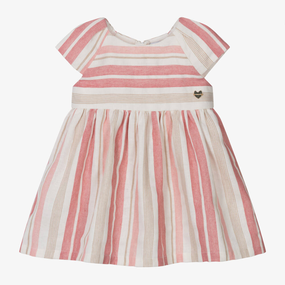 A smart dress for little girls designed by Mayoral, lined with cotton on the bodice. With pink, ivory and beige stripes, this comfortable dress is made in a breathable cotton and linen blend. It has feminine capped sleeves, a gold-tone logo charm on the waist, and a hidden zip closure on the back for neatness.