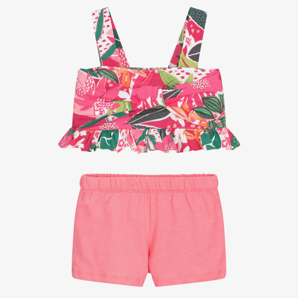 Pretty pink jersey shorts set for girls by Spanish brand Mayoral, made in sustainable cotton. The cropped vest top has a colourful tropical floral print with a large bow across the front, frilled hem and a shirred panel on the back for a comfortable fit. The plain slubbed pink shorts have an elasticated waist for practical pull-on.