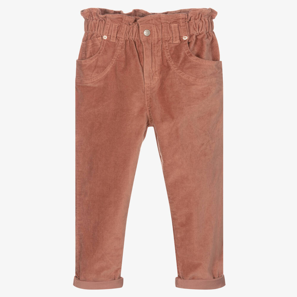Blush pink trousers for girls by Mayoral, made in soft cotton velvet. They have an elasticated paper bag waistband that fastens with a popper and zip. With a cool, casual slouchy fit, they are styled with five useful pockets.