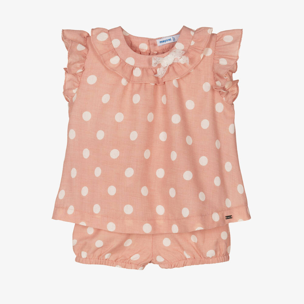 Cute dusky pink and white polka dot shorts set for little girls, by Mayoral. Woven in lightweight cotton, the top has a girly lace bow on the ruffle collar and flutter sleeves. It fastens with buttons on the back, and has a shiny silver logo embossed charm on the hem. To complete the pretty look, the ruffle bloomer shorts have stretchy elasticated trims for comfort.