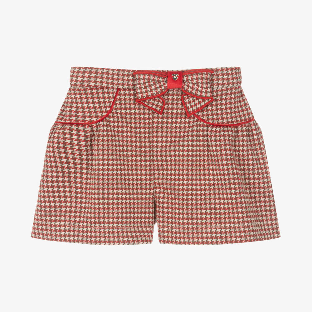 In a brown and red houndstooth pattern with a sparkly gold metallic thread, these smart shorts for girls are by Mayoral. There is a coordinating bow decoration on the front, with a velvet trim and silver diamanté heart in the centre. Made in stretchy jacquard fabric, the shorts have an elasticated adjustable waist for a comfortable fit.