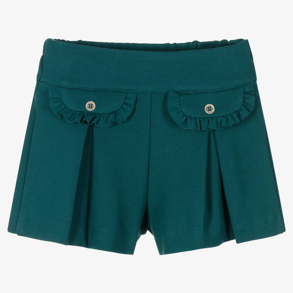 Teal green shorts for little girls by Mayoral, made in soft viscose jersey. The front is trimmed with faux flap pockets with ruffled trims and silver metal buttons. They have a wide fit and front pleats and a useful adjustable waistband.