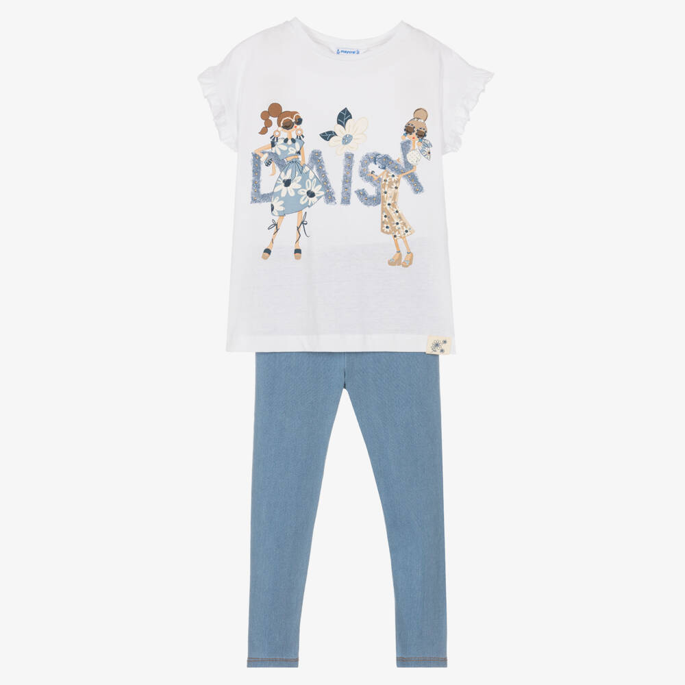 Casual and comfortable, this white and blue leggings set for girls by Mayoral is made with soft cotton jersey. Slightly longer with little frilled sleeves, the white T-shirt has a girly design in beige and blue with daisies, denim prints, brass stud detailing, and a daisy print tab on the hem. A pair of light blue, denim-look jersey leggings complete this lovely outfit.