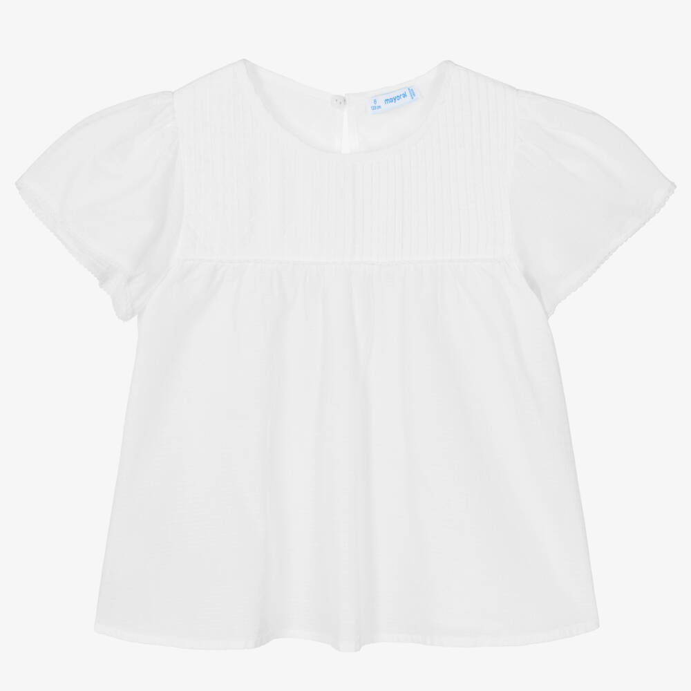 Pretty white blouse for girls by Mayoral, made in soft, lightweight cotton. This loose-fitting top has a timeless elegance, with a pintucked bodice and floaty butterfly sleeves. It has a single button fastening on the back.