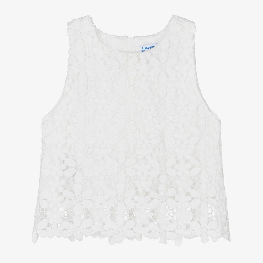 Gorgeous white lace sleeveless blouse for girls by Mayoral, made in beautiful floral patterned lace. This smart and stylish top is fully lined with lightweight voile and has a concealed zip fastening on the back.