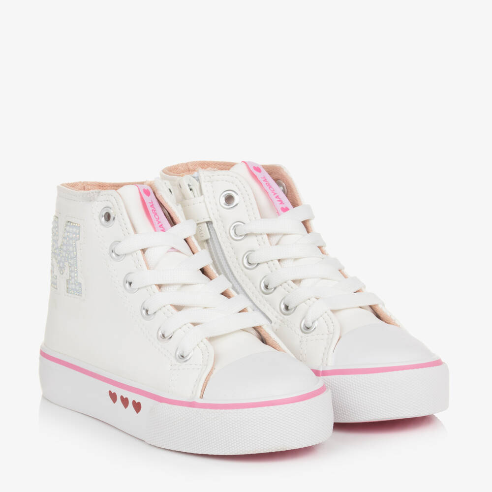 Super cool, white trainers for girls by Spanish brand Mayoral, with a large, pearl bead logo appliqué on the sides. Made in faux leather, with a comfortable cotton lining and cushioned insole, they fasten with laces, a side zip and a velcro tab. The chunky, non-slip white and pink rubber outsole has pretty red heart detailing.