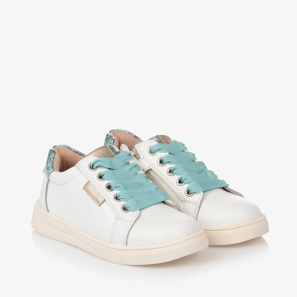 White leather trainers for girls by Mayoral with glittery blue trim on the heel and tongue. Fastening with a convenient side zip for speedy changing, they have blue grosgrain ribbon laces adding a pretty touch. They are comfortably lined in soft cotton corduroy, with padding around the heel and have a removable leather insole with antibacterial and odour-inhibiting properties. The flexible white rubber sole is textured for good grip and gold logo tabs on the side and heel add a branded finish.