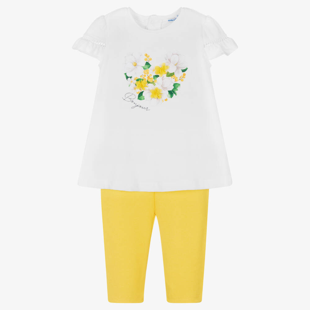 Lovely white and yellow leggings set for little girls, by Mayoral. Made in soft cotton jersey, the white crew neck T-shirt has a pretty floral artwork on the front with yellow tulle flowers and 'Bonjour' printed in sparkly silver. Fastening with poppers on the back, the sleeves have sweet cut-out details. It pairs with sparkly yellow leggings for a casual, coordinated look.