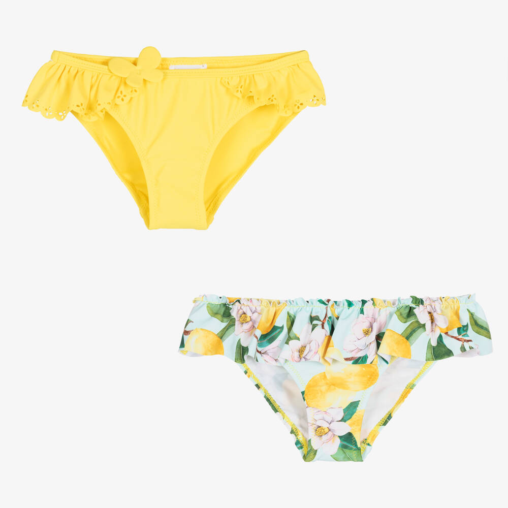 Two pairs of yellow and aqua blue bikini bottoms for girls from Mayoral, made in silky and stretchy jersey. Trimmed with ruffles on the waistband, one pair are blue with a sweet yellow, pink and green floral lemon print. The yellow pair are detailed with delicate cutwork ruffles and a butterfly on the waist.