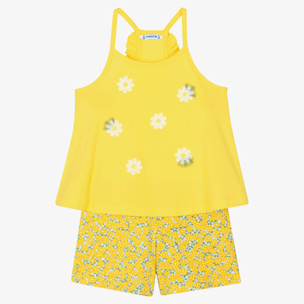 Beautiful yellow shorts set for girls by Spanish brand Mayoral, made in a soft cotton jersey. The vest top has sequin daisies with green tasselled leaves, and a racerback with pretty ruffled trims. Patterned in a yellow and blue ditsy floral print, the shorts have an elasticated waistband to provide comfort.