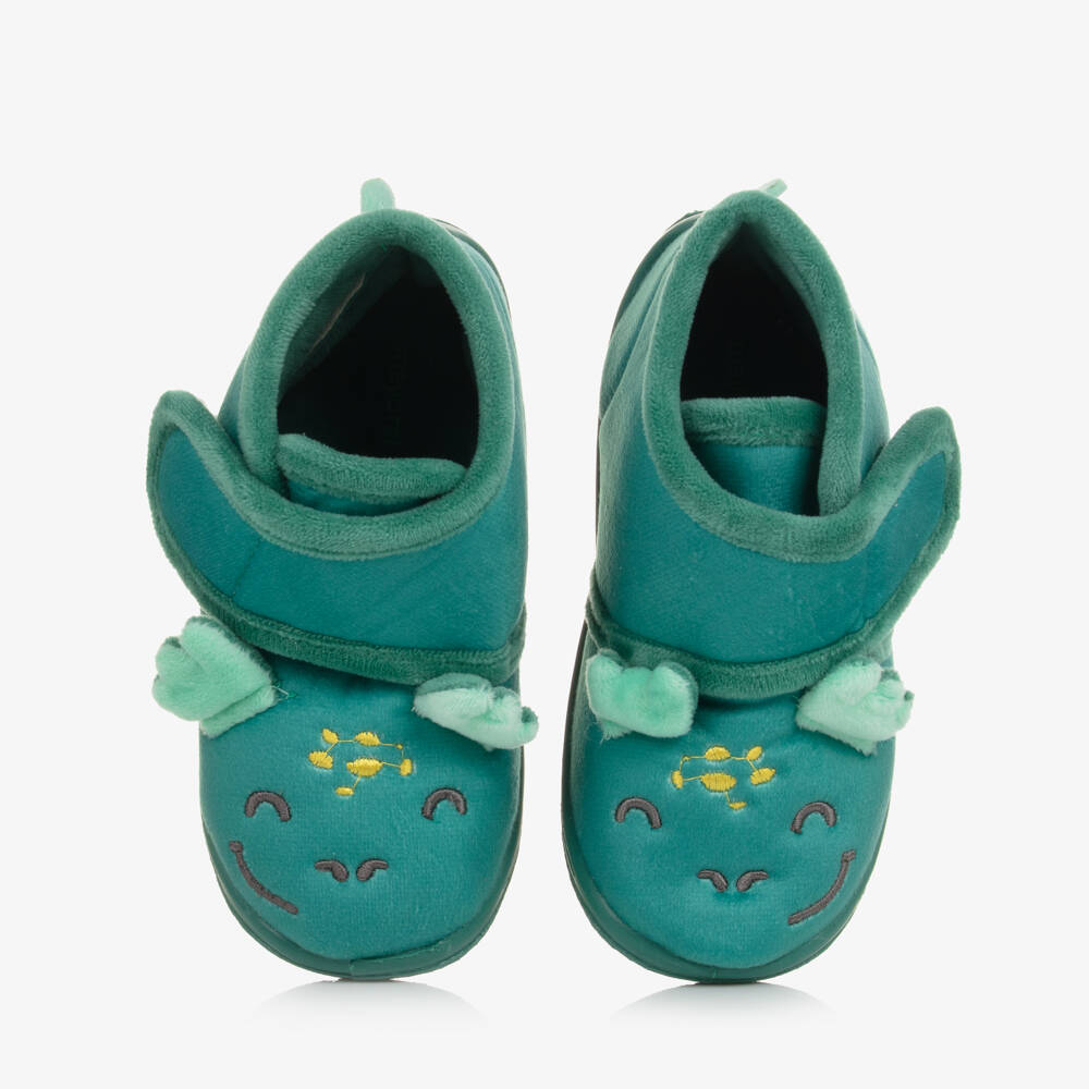 Green slippers for little boys and girls by Spanish brand Mayoral, with cute dinosaur detailing. Cosy and comfortable, these fun slippers are made in soft textile, with a broad velcro strap for easy fastening. There are non-slip rubberised soles for good grip.