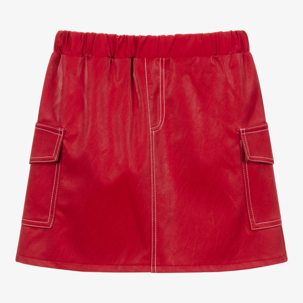 Red skirt for girls by Mayoral, made in mid-weight faux leather with a sheen. It has a comfortable, elasticated waistband and white stitching on the front, back and side pockets.