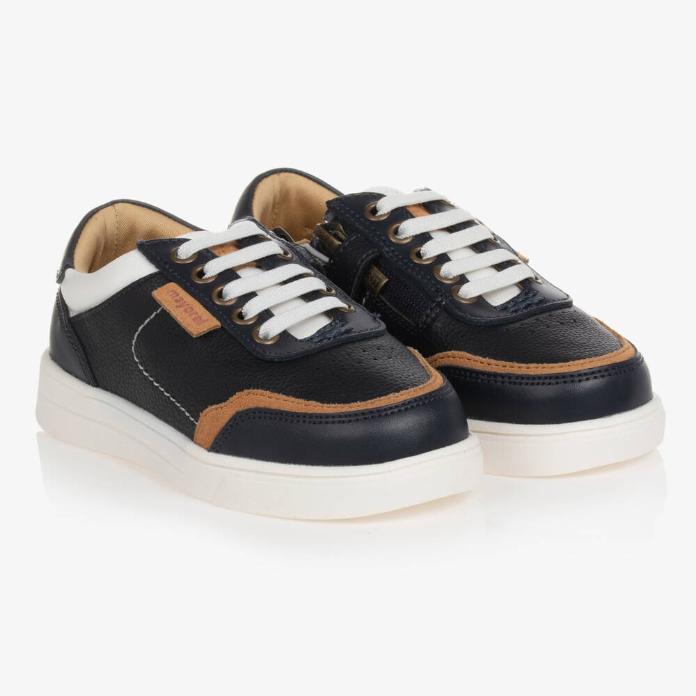 Navy blue and beige trainers for teen boys by Mayoral, with logo tabs on the side and on the tongue. Made in soft leather, the uppers have faux leather trims. They have a soft cotton twill lining, and a comfortable, breathable insole with moisture absorption capacity. Easy to get on and off, these casual trainers have elasticated laces and a small side zip fastening which is neatly secured with velcro. They have stylish white non-slip rubber outer soles providing good grip on slippery surfaces.