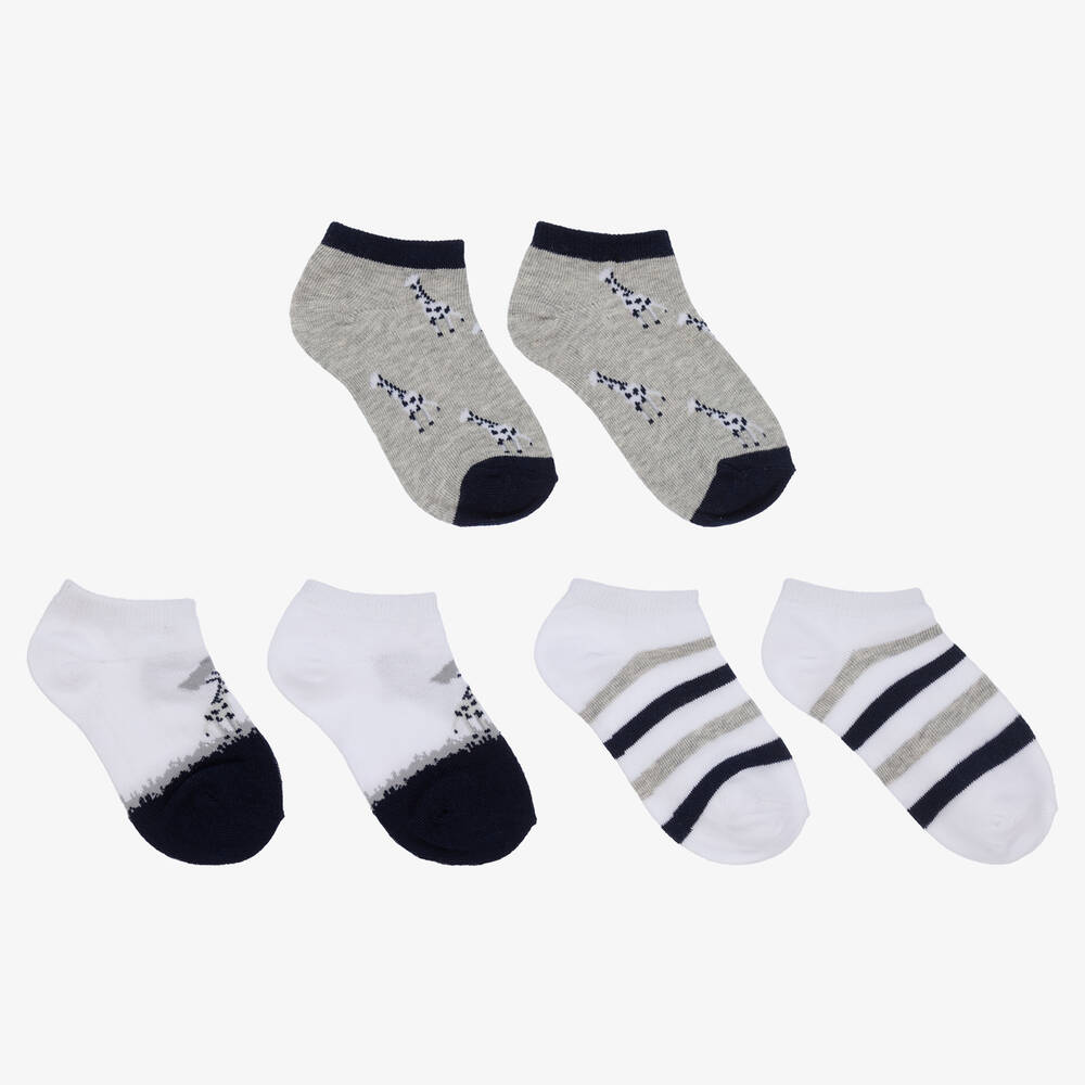 Three pairs of cotton socks for teen boys by Mayoral, in shades of white, navy blue and grey. In a sporty trainer style, one pair is patterned with stripes, with the others are finished in giraffe-themed designs.