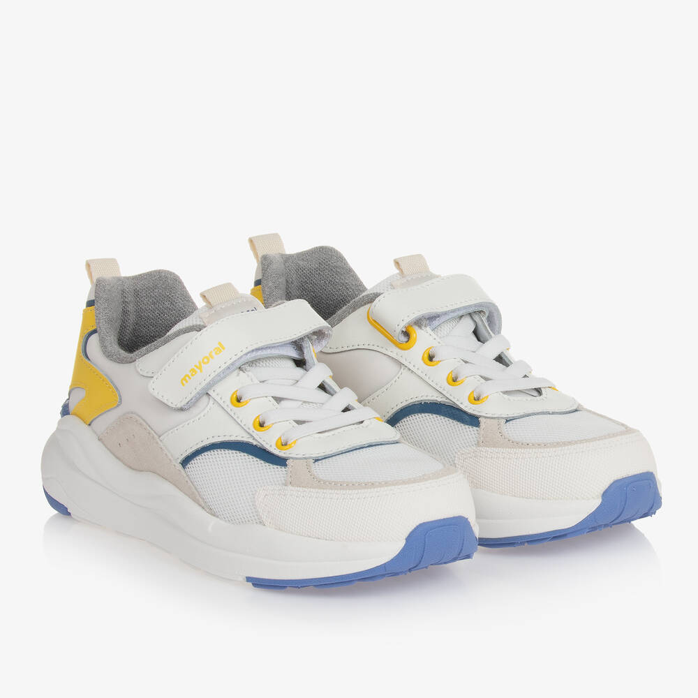White leather trainers for teen boys by Mayoral, with a rubberised logo patch on the heel. This stylish, sporty design has soft mesh panels and contrasting grey, blue and yellow trims. They have a comfortable cotton-blend lining, cushioned heels and removable insoles with moisture-wicking properties. They fasten with a branded velcro strap and have elasticated laces allowing them to slip on easily. Non-slip rubber outer soles ensure good grip underfoot.