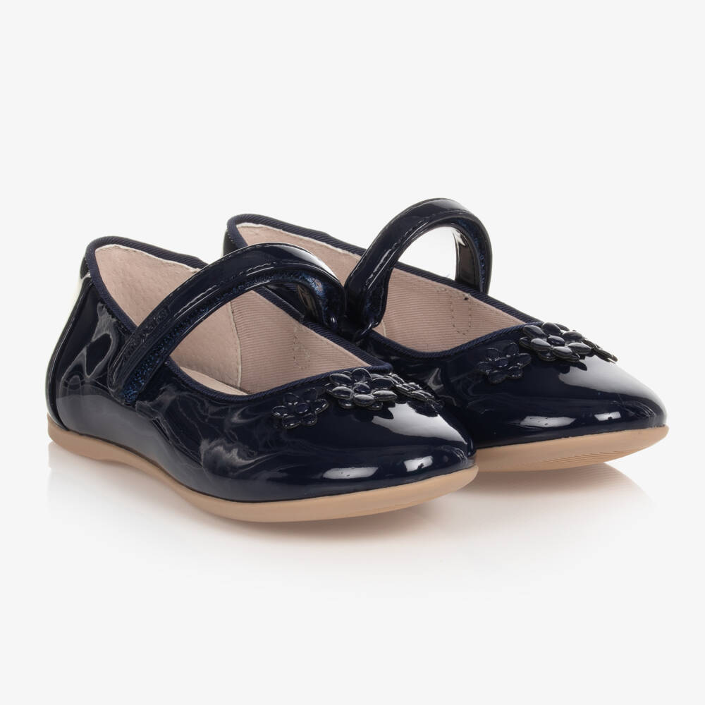 Sweet navy blue faux patent leather ballerina pumps for teen girls by Mayoral. They have a logo on the velcro-fastening strap and a pretty 3D floral appliqué on the front. They have a cotton twill lining, with a soft leather heel and a gently padded leather insole for comfort. The non-slip rubber outer sole provides good grip on slippery surfaces.