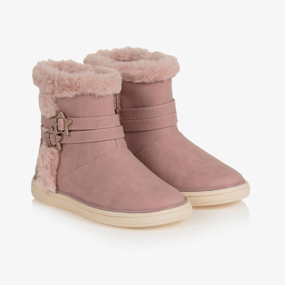 Comfortable ankle boots for teen girls by Mayoral in powder pink faux suede leather with super soft faux fur trims. Two straps with star- shaped buckles around the cuff are for decoration as they have an easy to use zip fastening on the side. As well as being eye-catchingly stylish, they are lined with cotton corduroy for comfort and have non-slip rubber soles with pink trim, for improved grip.