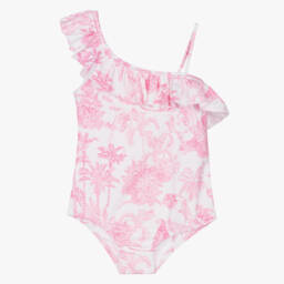 A gorgeous white and pink swimsuit for girls by MC2 Saint Barth, with an array of exotic trees and jungle animals in a charming Toile de Jouy inspired design. Stylish for the beach or pool, this asymmetric one-piece has a beautiful ruffle trim around the top and a slim adjustable shoulder strap to ensure a comfortable fit.