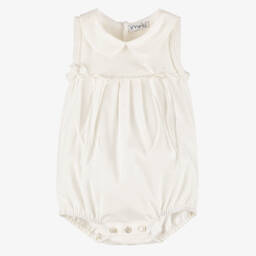 A traditional blue-grey and white cotton shortie by Mebi. The top of this sweet one-piece is softly knitted and styled with a gingham check collar to match with the lower, woven part. It fastens neatly on the back and between the legs with mother-of-pearl buttons.