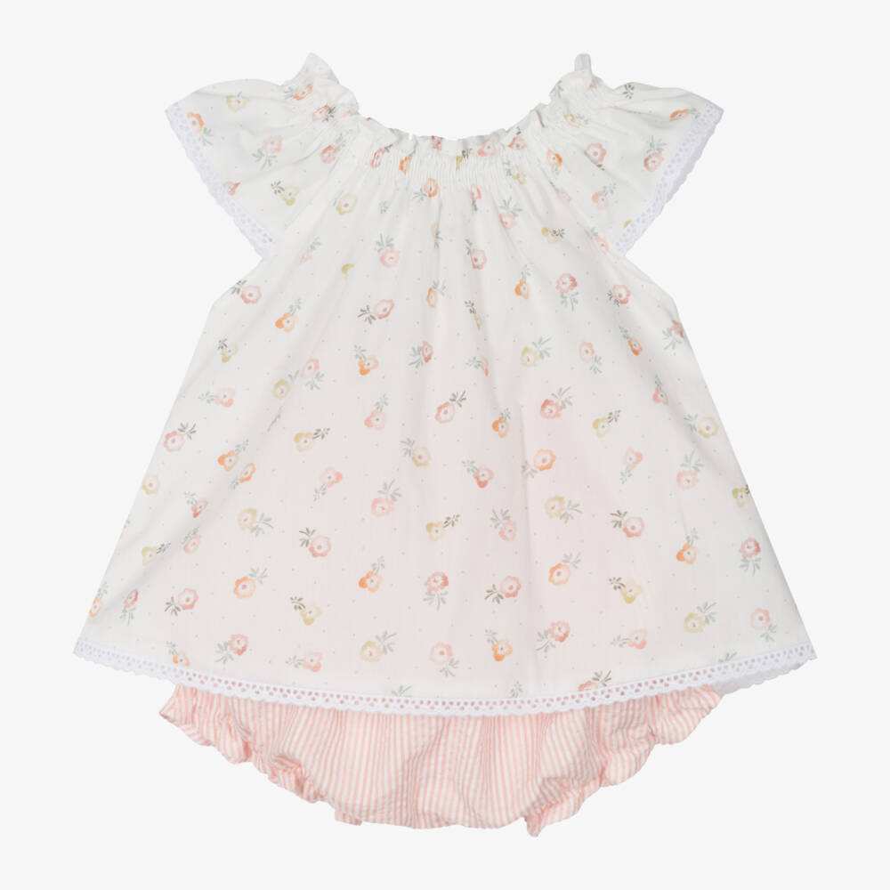 Sweet and pretty, this ivory and pink shorts set for little girls by Mebi is made from a smooth cotton weave. Patterned with a lovely floral print in muted pastel shades, the short-sleeved tunic top is trimmed with embroidered lace for a classic finish. It has a shirred high neckline and there are beige button fastenings on the back. The stripey bloomer shorts have frilled elasticated cuffs and waistband for a comfortable fit. Mebi is a very small fitting brand, please choose a size up to allow room to grow.