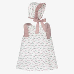 For little girls from Spanish brand Mebi, a charming white cotton dress set. Patterned with a delicate blue floral print and contrasting gingham bows on the shoulders, this sweet A-line dress fastens with buttons. A matching bonnet with ruffle detailing completes the look.