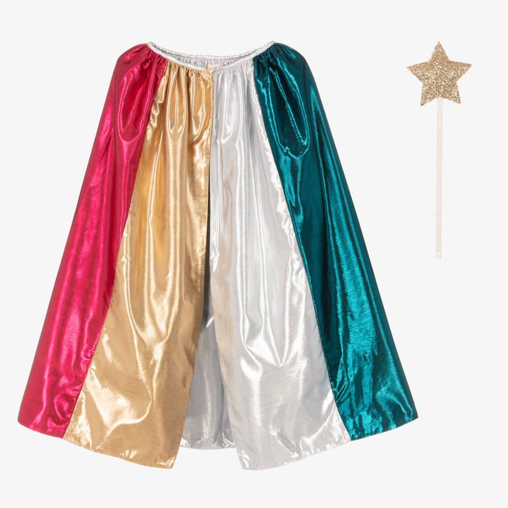 Boys and girls will feel magical in this colourful metallic cape and wand set from Meri Meri. Your little one will shimmer in a rainbow of colours in the lovely cape and have endless fun with the gold glitter and velvet wand. The cape fastens easily with a popper on the front for quick dressing.