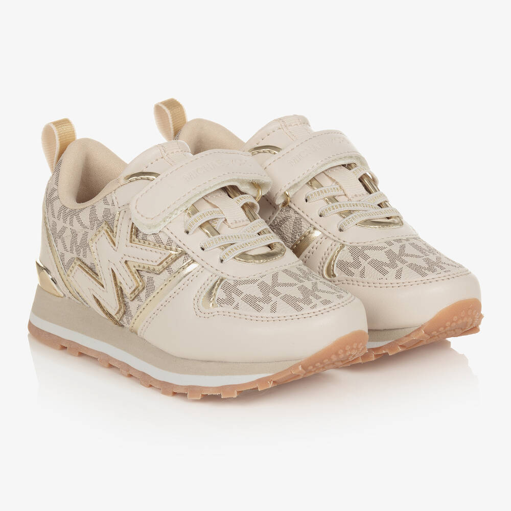 Ivory trainers for girls by Michael Kors, with metallic gold trims and a repeated all-over MK logo design. With sparkly elasticated laces, these classic, sporty trainers have a branded velcro strap and the designer's initials appliquéd on one side. Set on thick rubber soles, they have a soft textile lining, with a padded insole for comfort.