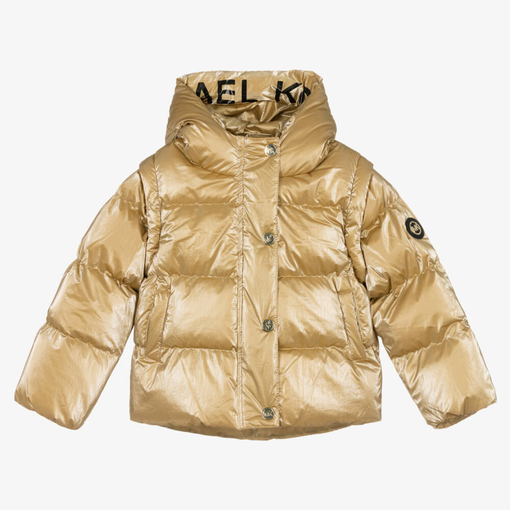 In metallic gold with a gorgeous sheen, this puffer jacket for girls is by Michael Kors Kids. Instantly recognisable, it has a large black logo printed around the hood and a metal logo badge on one arm. To help keep out chilly winds, the cuffs are gently elasticated and there is a popper fastening storm flap over the front zip. The sleeves are detachable, turning it into a stylish hooded gilet. Silky smooth and softly padded for warmth, the jacket has a silky smooth lining and useful front pockets.